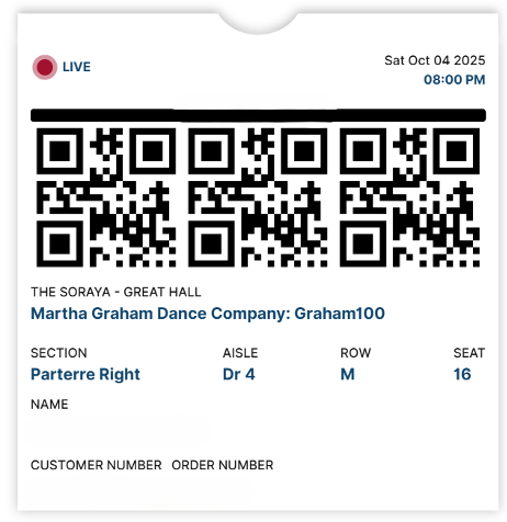 The tickets for your next performance appear. If you have multiple tickets for the performance, you will need to swipe left to view the other tickets and then swipe right to go back to the previous tickets. (Note: Although you will see 3 QR codes, each of these QR codes are the same and are linked to the same ticket. You will not need to scan each QR code.)